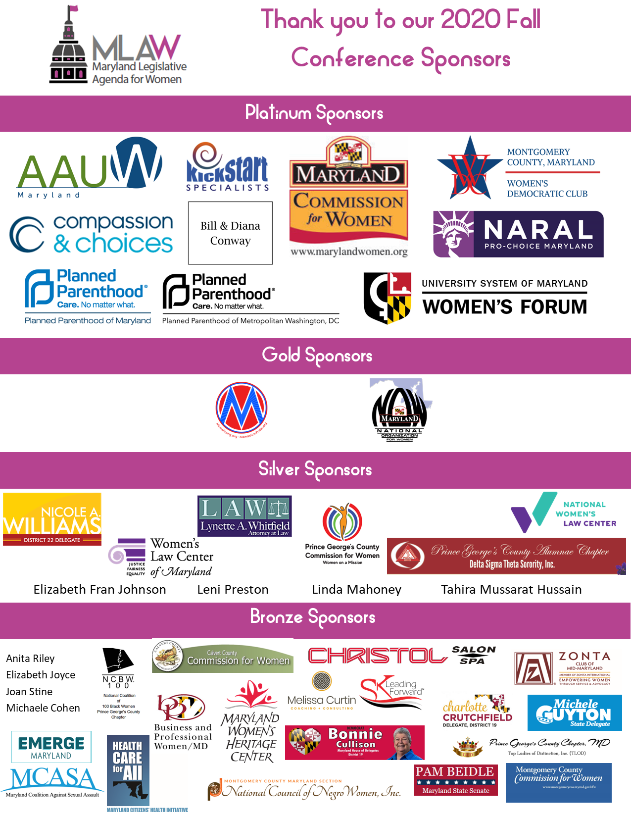 Saturday’s conference was not only our first successful virtual conference, but we had our largest crowd yet, with over 300 attendees from all over the state and even as far away as Arizona! The event was supported by the most sponsors ever – 43 in all! And most importantly, we were able to meet with all of you, albeit not in person, to come together for the common purpose of enhancing the lives of women and families in Maryland through legislative advocacy.