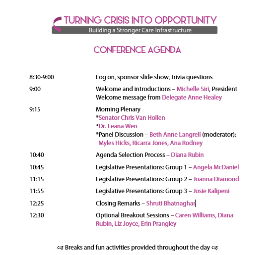 - Time to Care Act: This legislation would ensure Marylanders no longer have to choose between the job they need and the family they love by establishing a family and medical leave insurance fund to provide partial wage replacement for employees who take leave to care for a new child, a family member with a serious health condition, their own serious medical condition, or a family member’s military deployment.